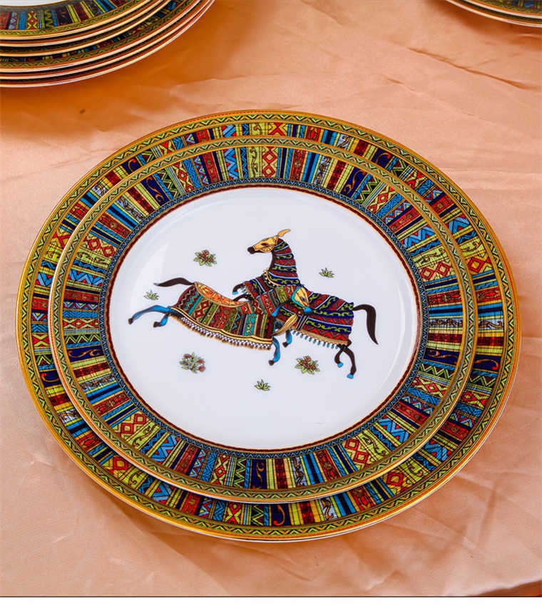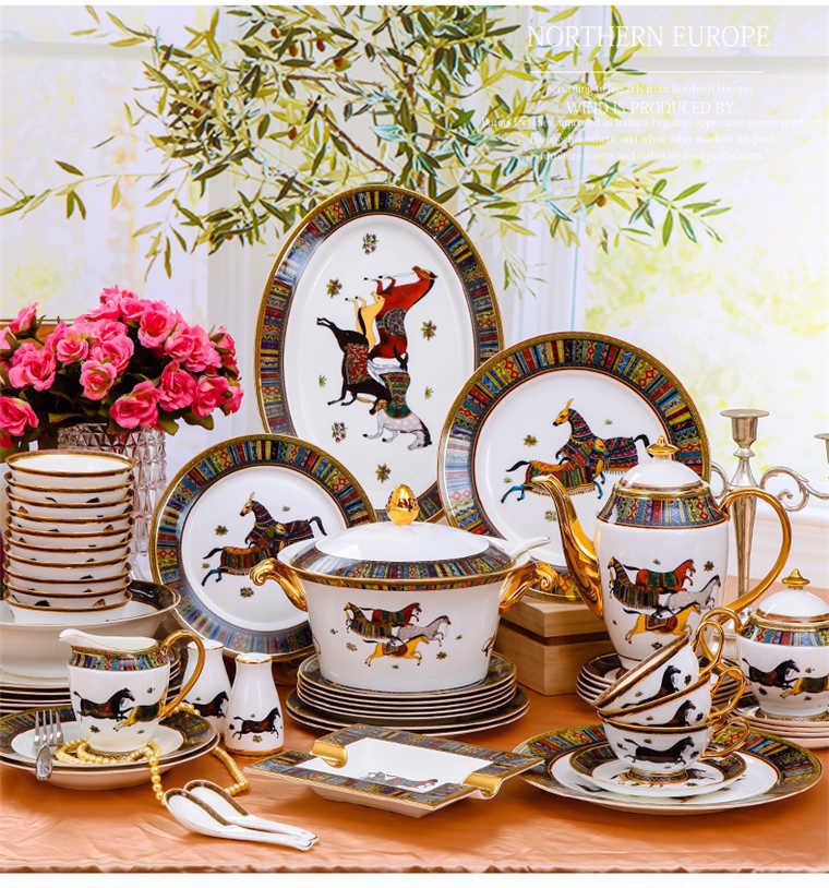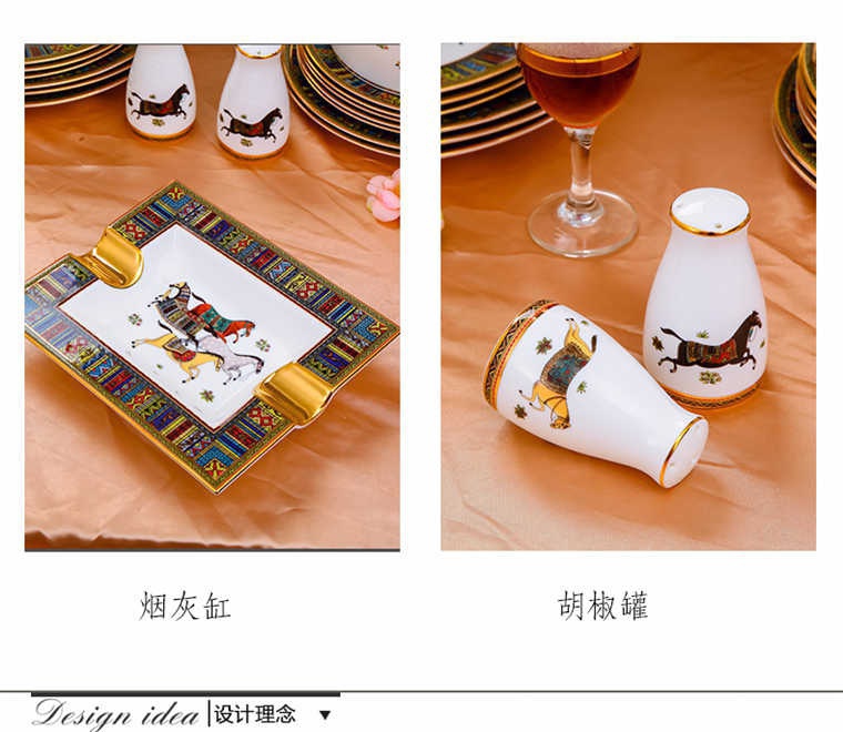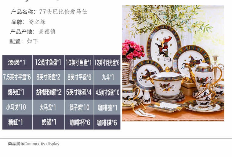 77頭巴比倫愛馬仕,一個湯煲,一個12寸魚盤,一個10寸魚盤,六個12寸月光盤,六個7.5寸平盤,兩個8寸湯盤,六個8寸平盤,一個九斗,一個煙灰缸,兩個胡椒粉罐,四個5寸味碟,十個4.5寸飯碗,十個小馬戈,一個大馬戈,十個筷子架,一個咖啡壺,一個糖缸,一個奶罐,六個咖啡杯,六個咖啡碟。