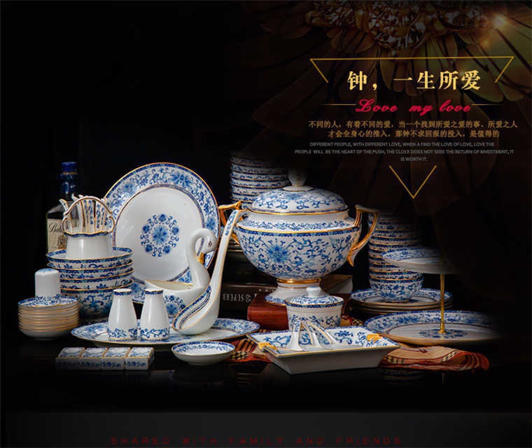 90頭青花餐具,一個宮廷湯煲,一個十二寸魚盤,一個10寸平盤,一個10寸月光盤,一個9寸平盤,一個9寸湯盤,四個8寸平盤,四個8寸湯盤,四個6寸高腳面碗,十個4.5寸飯碗,十個4寸湯碗,十個7.5寸淺盤,十個4寸小蝶,十個筷架,十個天鵝小勺,一個天鵝大勺,一個花籃,兩個胡椒瓶,一個牙簽筒,一個大煙灰缸,一個雙層水果盤,一個美鵝,一個毛巾碟,兩個燉盅。