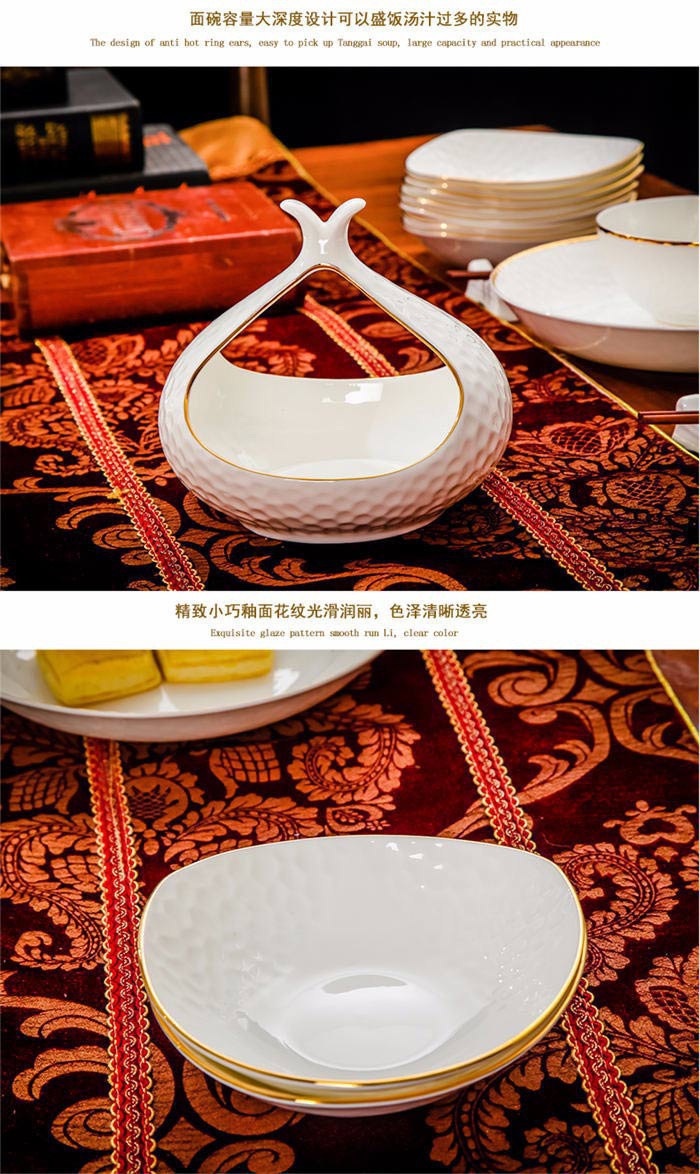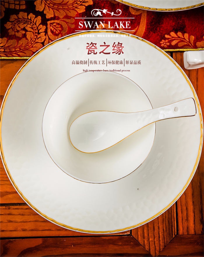 60頭水立方,一個(gè)湯煲,一個(gè)魚(yú)盤(pán),一個(gè)十寸圓盤(pán),一個(gè)飯勺,一個(gè)花籃,一個(gè)牙簽筒,四個(gè)面碗,十個(gè)4.5寸飯碗,十個(gè)三角骨碟,十個(gè)八寸盤(pán),十個(gè)調(diào)羹,十個(gè)筷子架。