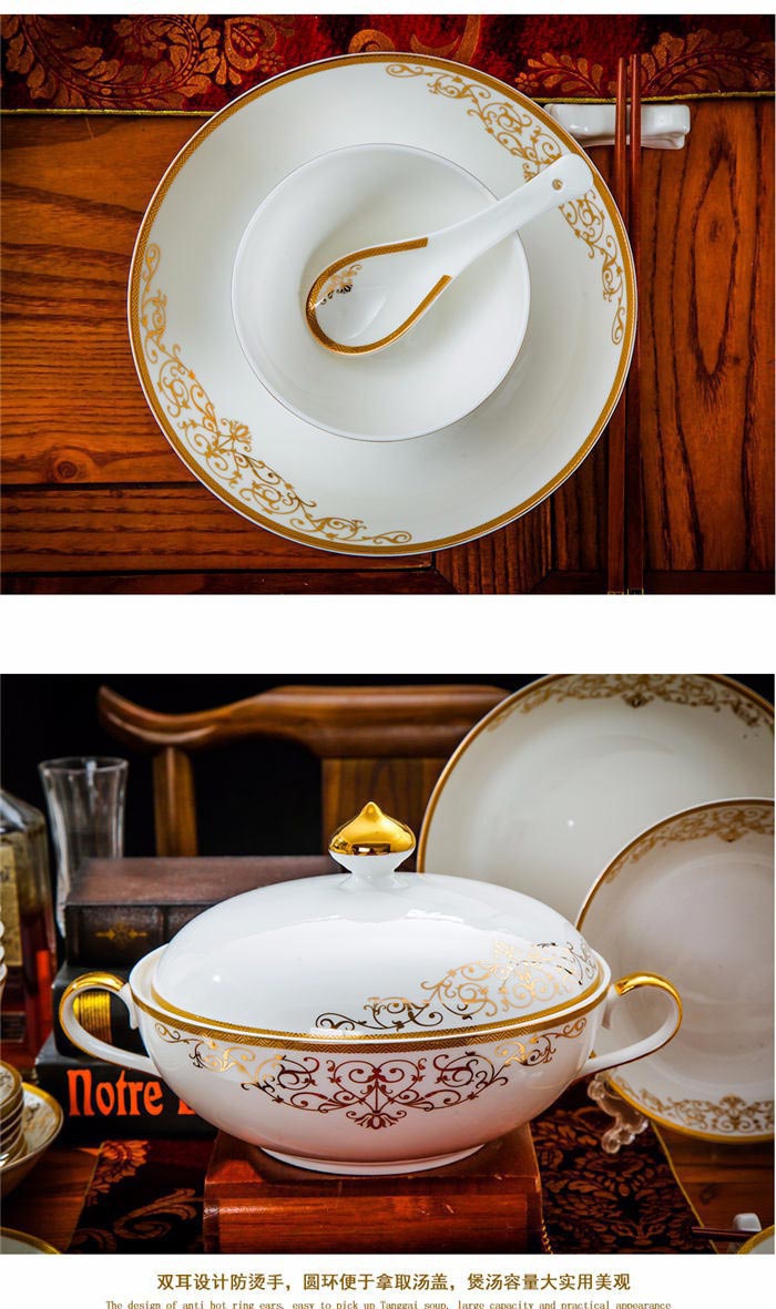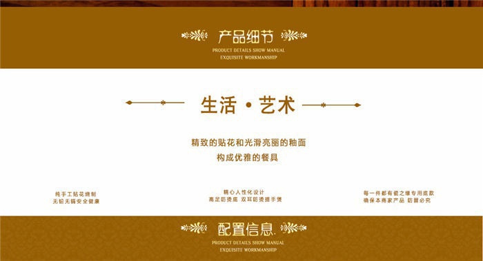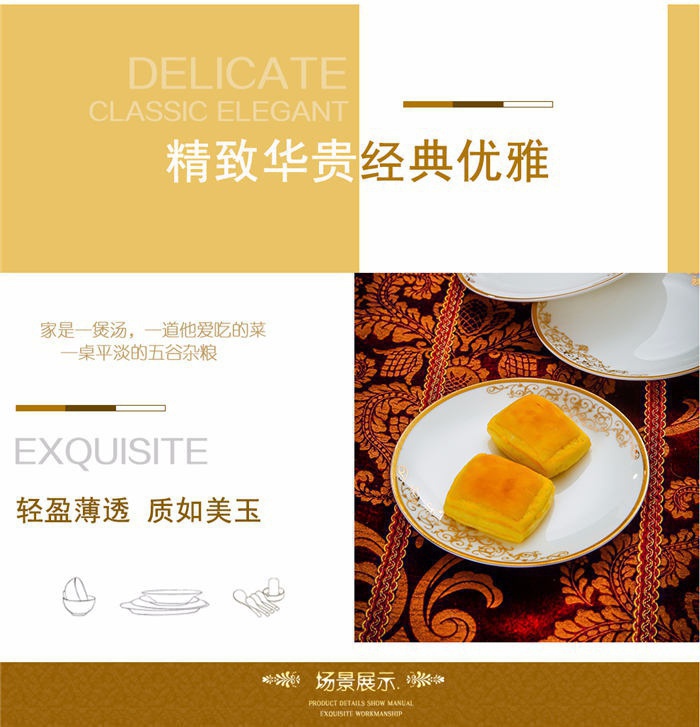 60頭相思,一個(gè)湯煲,一個(gè)魚盤,一個(gè)10寸大圓盤,一個(gè)飯勺,兩個(gè)沙拉碟,四個(gè)面碗,十個(gè)4.5寸飯碗,十個(gè)5寸骨碟,八個(gè)8寸圓盤,兩個(gè)8寸方盤,十個(gè)調(diào)羹,十個(gè)筷子架。